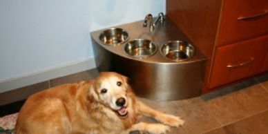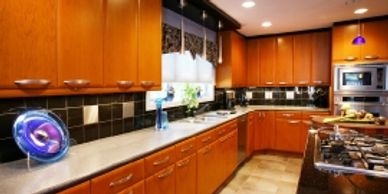 Cherry wood pillow edged cabinets with 4 unique counter top materials